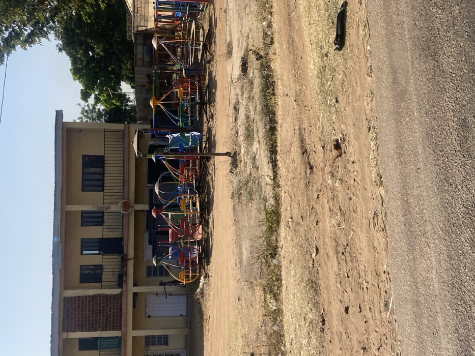 The image depicts an outdoor scene in Barnawa, Nigeria, under a clear blue sky. In the background, a two-story building with a light beige/yellow facade is visible. The ground floor features a white double door on the left and several windows, while the upper floor has multiple dark-framed windows and doors opening onto a balcony with black metal railings. A section of exposed, patterned brickwork is present on the upper left side of the building's facade. A round, red object is affixed to the wall below the center of the first-floor balcony. In front of the building, situated on a large area of reddish-brown dirt and dry, sparse vegetation, is a collection of colorful playground equipment. This includes at least five distinct merry-go-round type structures with multiple seats in red, yellow, blue, and green hues. Additional metal playground structures are partially visible further to the right. An upright pole, possibly for lighting, with a light-colored, disc-shaped top, stands in the dirt area between the foreground and the playground. The foreground consists of a section of gray asphalt road. Immediately beyond the road, a wide strip of dry, unpaved earth with scattered dry grass and debris extends towards the playground. A dark, elongated object rests on the dry grass in the lower right portion of the dirt area. No individuals or active interactions are present in the scene.
