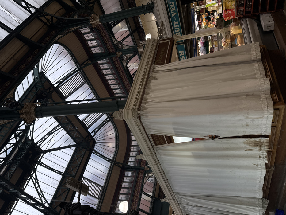 The image displays the interior of Kirkgate Market in Leeds, United Kingdom. The upper section reveals an elaborate, arched roof structure composed of numerous transparent or translucent panels supported by a dark green metal framework. Ornate dark green columns with decorative, possibly gilded, capitals extend upwards, supporting the roof structure. Below the main roof, a continuous band of small, dark-framed windows is visible above a reddish-brown and cream decorative frieze. In the midground, a large stall unit is central, enclosed by off-white fabric curtains that exhibit visible staining, particularly along their lower portions. A significant tear or hole is present in one of the left-side curtain panels. The stall's top edge features an ornate, cream-colored cornice with shell-like embellishments. Partially visible signage above the curtains includes "NEST B...", "CONFEC...", and "Payne". To the right, another market stall is visible with a prominent "FRUIT and VEG" sign in blue lettering on a white background. This stall displays various items in refrigerated cases, including yellow blocks, red-packaged goods, and other produce. A white cardboard box rests on the floor in front of the fruit and vegetable stall. No individuals are distinctly visible within the scene.
