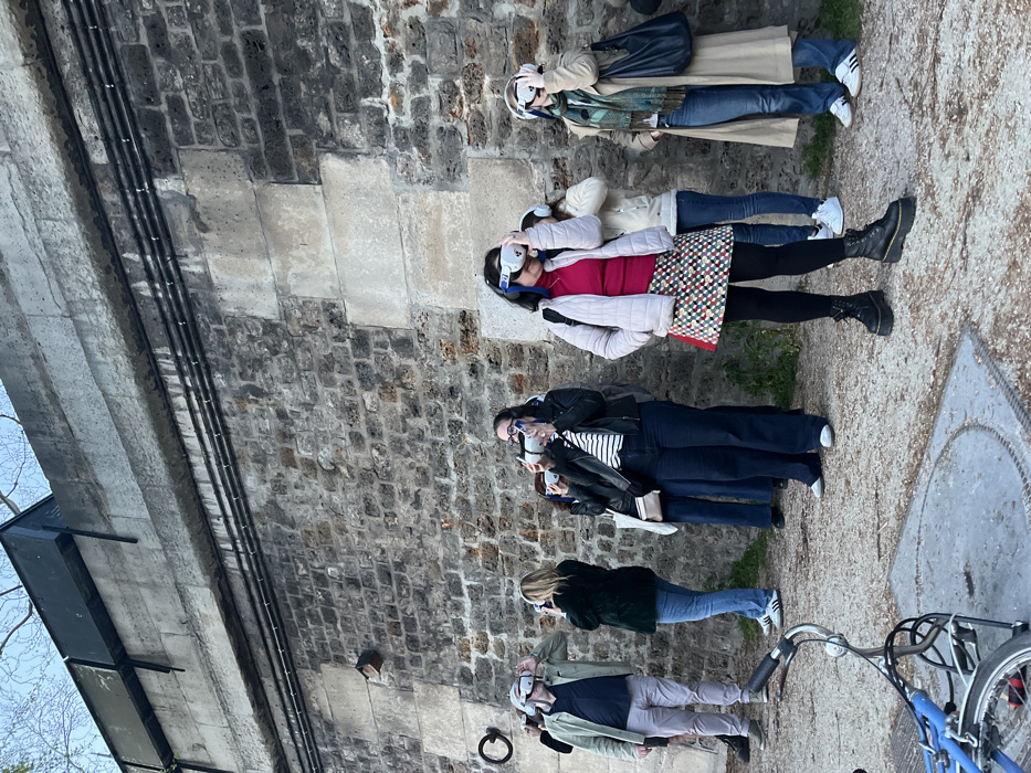 A group of seven individuals is observed outdoors, standing alongside a weathered stone embankment wall in Paris, France, likely adjacent to the Seine River