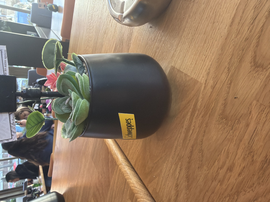 This image depicts an interior scene within a cafe or restaurant, identified as being located in Burgas, Bulgaria. The primary subject in the foreground is a black, rounded planter pot containing artificial green and pink succulent plants, positioned on a light-colored wooden table with visible grain patterns. A yellow rectangular sticker bearing the white "Schweppes" logo is affixed to the side of the planter. To the right of the planter, a portion of a circular, metallic silver ashtray is visible. To the far left, a blurry metallic object, possibly part of another table setting, is partially present. In the midground, behind the planter, a black stand holds a piece of white paper with partially visible text, which appears to be in French, including phrases like "la charge" and "les autres agences." Several individuals are seated at tables in the background. A woman with long dark hair is positioned with her back largely to the camera, wearing a dark top, with her hands resting on a table surface. To her right, another woman with lighter hair is partially visible, looking downwards. Other patrons and blurred furniture are present further back. The background features large windows, suggesting an outdoor view with some blue elements. The overall environment appears well-lit, likely by a combination of natural light from the windows and interior lighting.