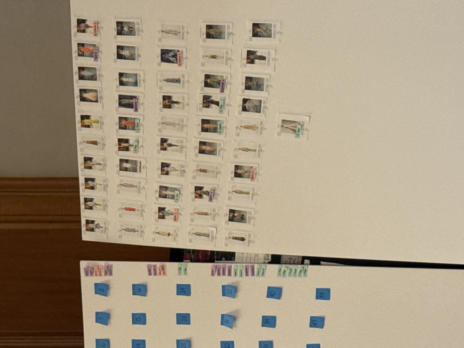 white wall with several small, square pictures attached, seemingly pinned up in rows