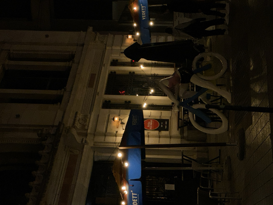 The image depicts a nighttime scene in central Brussels, Belgium, likely on Rue du Lombard, featuring the outdoor seating area of "The Italian Pizza Company." A multi-story, light-colored building with classical architectural details, including decorative cornices, pilasters, and friezes, forms the background. The ground floor exhibits large window/door openings; one is partially obscured by a dark metal gate. In the foreground, a paved sidewalk hosts an outdoor dining setup. Two large, blue patio umbrellas, each emblazoned with "VEDETT" in white lettering, are open and illuminated by string lights with warm bulbs draped across them. A third, dark, closed umbrella stands to the right. Several dark metal tables and chairs are positioned beneath and around the umbrellas. A prominent circular red sign on the building wall identifies "The Italian Pizza Company," with "EAT - IN" and "TAKE - AWAY" indicated below. Additional warm light is provided by wall-mounted sconce lamps on the building facade. A stylized, light-colored humanoid figure, resembling a mannequin, is depicted riding a stylized bicycle. The figure wears a pink top and dark shorts, possesses a large, owl-like head, and sits on a bicycle with a blue frame and solid white wheels. This figure is positioned in the lower-center of the frame. Two indistinct human figures are partially visible in deep shadow on the far right, appearing to walk past the establishment. The overall scene is dimly lit by artificial sources, creating a contrasting interplay of light and shadow.