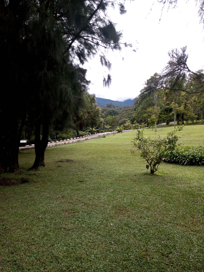 A tranquil scene unfolds with lush green grass dominating the foreground. Tall, dark trees frame the left side, contrasting with the bright, open lawn. A winding road with white-marked edges cuts through the landscape, leading towards distant trees and a mountain range shrouded in mist. A small, bare tree and a patch of green plants sit on the right, adding depth to the composition. The sky is overcast, casting a soft, diffused light over the entire scene.