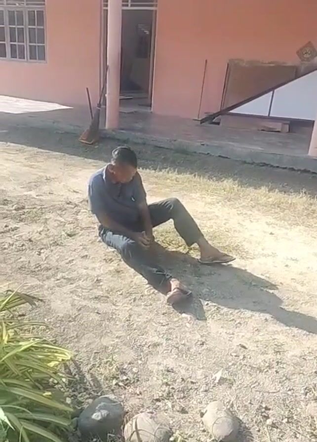 A man is sitting on the ground in front of a light pink building with white trim. He is wearing a gray shirt, dark pants, and sandals. He appears to be holding his leg and looking down. There are a few rocks and some green plants in the foreground. In the background, there is a broom leaning against the wall of the building. There are also some pieces of wood and a partial sheet of white material on the ground. A window can be seen with multiple panes and a door opening. The ground is dirt and dry grass. It is sunny.