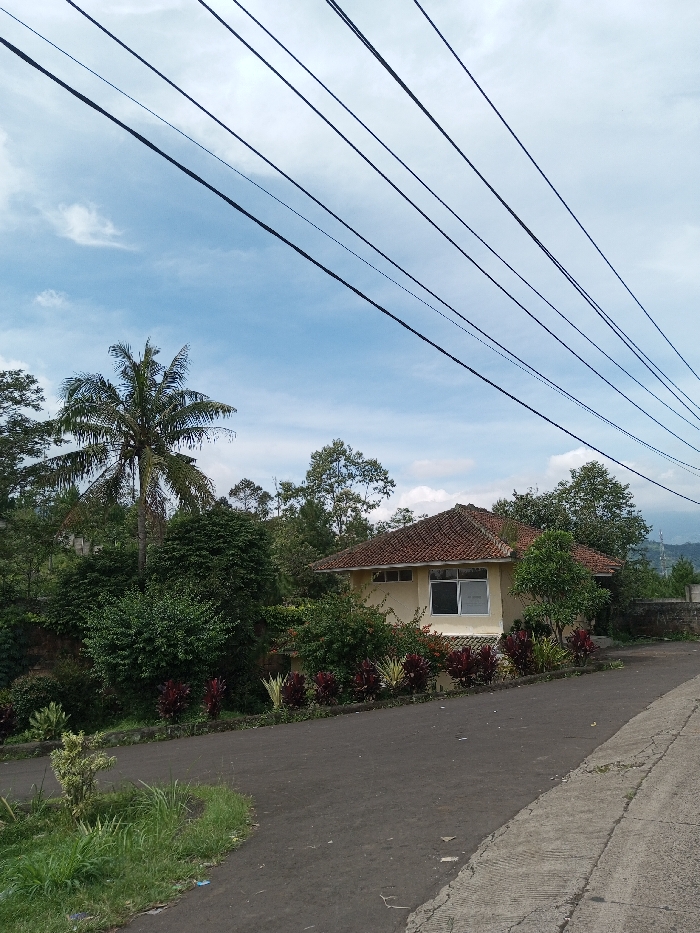 The image captures a static street scene in Kandenuwara, Sri Lanka, under a partly cloudy blue sky. Six dark utility lines run diagonally across the upper portion of the frame, from the upper left to the upper right. In the mid-ground, a single-story, light yellow building with a red-tiled hip roof stands slightly right of center, surrounded by dense green vegetation. This building features a large window with white frames on its visible facade. To the left, a tall palm tree bearing coconuts is visible behind a mass of green shrubs. The foreground consists of an asphalt road curving slightly to the left, bordered on its right by a cracked concrete shoulder. A patch of green grass with a small, light-colored plant occupies the immediate lower-left foreground. A row of red-leaved plants and some striped green-and-white plants line the edge of the property in front of the building. Distant hills or mountains are faintly visible on the horizon through gaps in the trees. No individuals or active subjects are present.