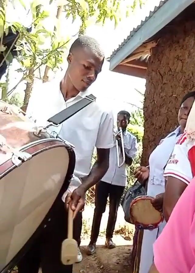 A young man plays a large drum with a beater while standing outdoors with a band. He wears a white shirt and the drum is slung over his shoulder with a strap. Other people, including women and men, are visible around him. One woman is playing a tambourine. The environment appears to be a yard with trees and a building constructed with natural materials. The weather seems sunny.