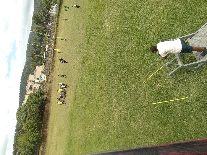 The image displays an active outdoor rugby field situated in the city of Nakuru, Kenya, under a partly cloudy sky
