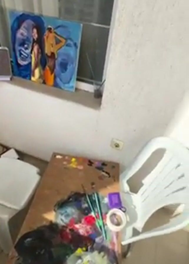 painting setup on a balcony, including a palette with oil paints and brushes, two plastic chairs, and a finished painting propped up against a window. The camera then shifts to show a young woman looking at the camera. She's wearing a beige sweatshirt with a skeleton print. She sticks her tongue out and smiles. The camera then pans down to show the floor of the balcony, with various items scattered around, including shoes and other unidentified objects. The balcony appears to be part of an apartment building.