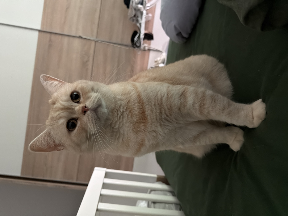 - "A cream-colored domestic cat, possibly a British Shorthair, sits upright and centered on a dark green fabric surface, facing directly towards the viewer" by FM-RZ2bK2, licensed under CC BY 4.0