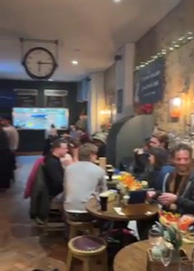 crowded pub or bar with people sitting at tables and standing at the bar. The room is decorated with festive lights, pictures, and other decorations on the walls. People are talking, laughing, and drinking. There are drinks and food on the tables. There is a clock hanging on the wall. The overall atmosphere appears lively and convivial.