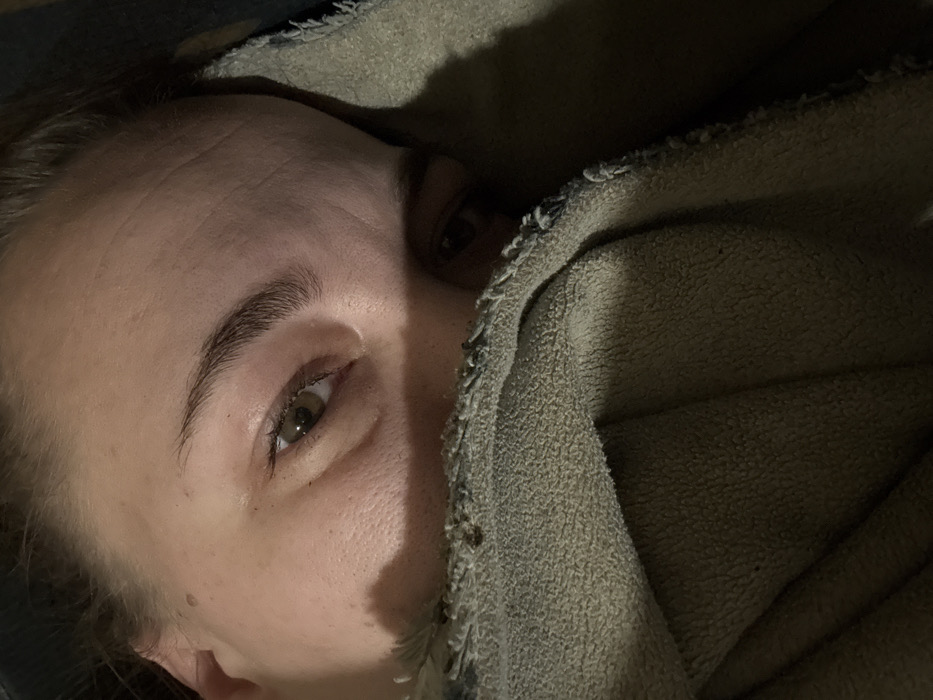 The image displays a close-up, angled view of an individual's upper face, situated indoors in the city of Dmitrov, Russia. The person, appearing to have light skin, presents their right eye fully visible, characterized by a light brown or hazel iris. The right eyebrow is dark and naturally shaped. Several small, dark moles are visible on the skin of the right temple area. The forehead exhibits faint horizontal lines. The lower portion of the face, encompassing the nose and mouth, is covered by a light grey or beige, textured fleece-like fabric, likely a blanket or similar covering. The fabric's stitched edge is discernible across the mid-face. The left eye is largely obscured by shadow and the fabric, with only a partial view available. The individual's gaze is directed forward. The environment is dimly lit, casting shadows beneath the right eye and along the fabric line. No other subjects or distinct background elements are visible.