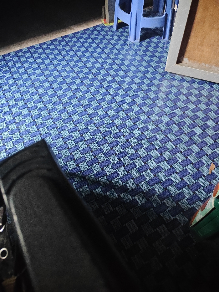 close-up of a checkered blue and black floor covering. The floor covering is likely a rug or mat. In the background, a blue plastic stool and a portion of a wooden door are visible. A black object, which could be a piece of furniture or a large bag, is in the foreground, partially obscuring the checkered floor pattern. The scene is likely in a home or a small business in Kawpamagon, Myanmar. There are no people present in the image.