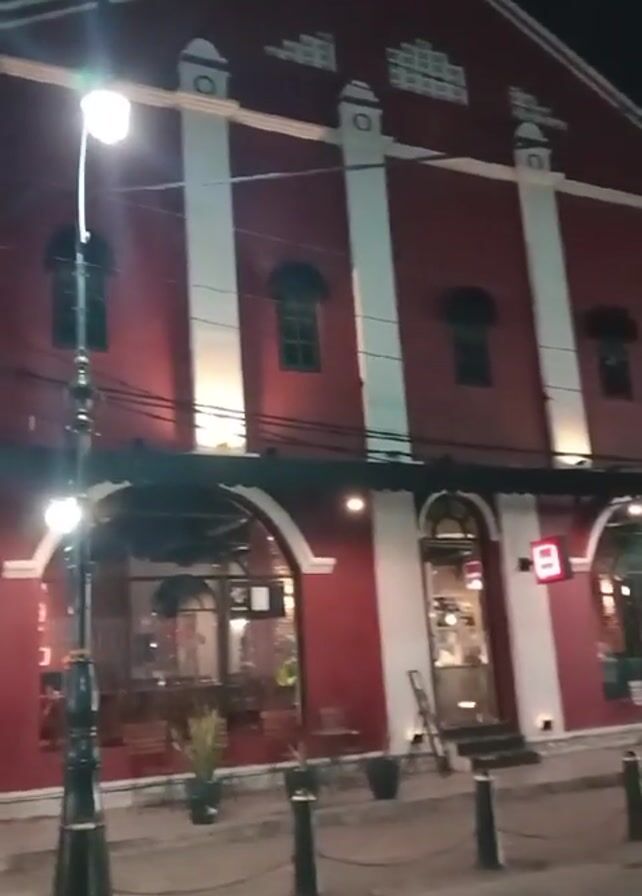 two-story building at night, with a red exterior and white vertical stripes. The building appears to be a restaurant or cafe, with arched windows and doors. There are some tables and chairs visible inside and in front of the building. Several short bollards line the sidewalk in front of the building. A lamppost stands near the left side of the frame. The sidewalk is paved, and the street appears to be empty of traffic. The sky is dark.