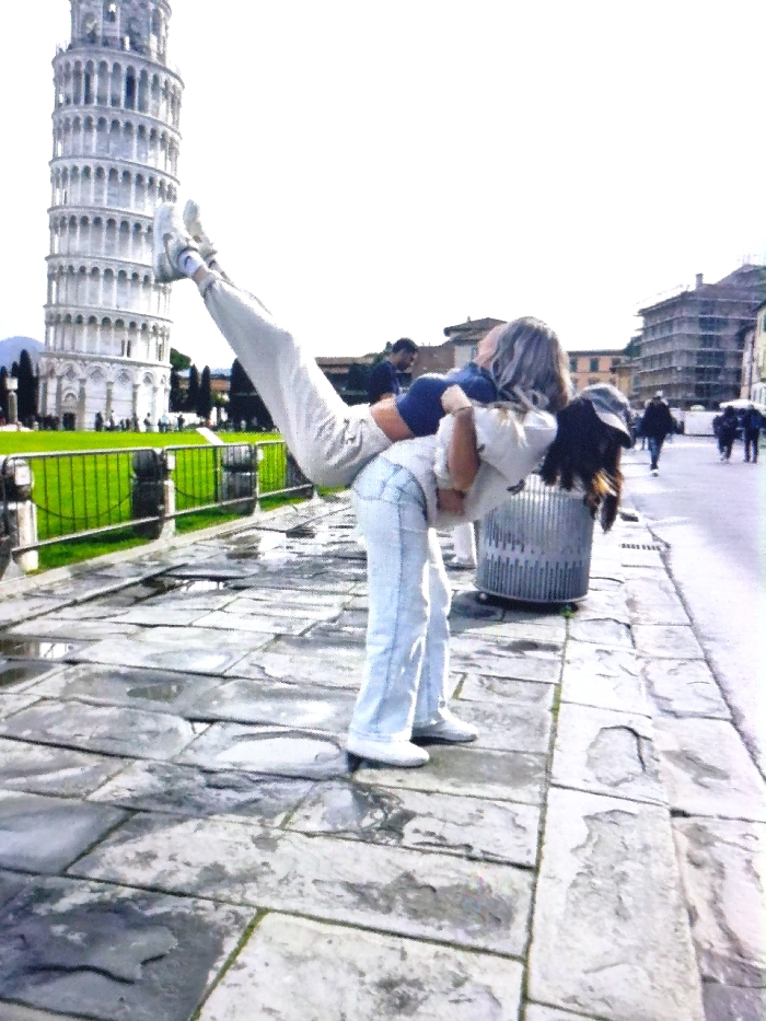 The image depicts two individuals posing on a grey stone-paved pedestrian area in Pisa, Italy