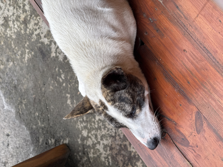 - "A dog with white fur covering most of its body rests on a wooden surface, likely a porch or deck" by FM-3l5D82, licensed under CC BY 4.0
