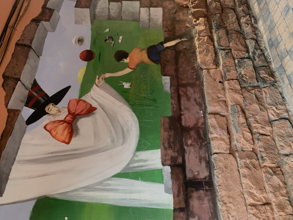 The image displays a large mural painted on a brick wall in Yerevan, Armenia. The mural portrays a surreal landscape viewed through an illusion of a partially destroyed reddish-brown brick wall. A central, large figure with a fair complexion, wearing a black top hat with red stripes, a prominent red bow tie, and a white flowing garment, smiles and extends an open right hand. A smaller boy, dressed in an orange shirt and blue shorts, is depicted climbing over the painted brick foreground, reaching his left hand back towards the larger figure. The mural's background features a vibrant green undulating field under a light blue sky with a distant yellow sun. Floating elements within this scene include a red sphere and a disembodied human eye. Two white rabbits stand in the middle ground, near the boy. Further in the background, two small figures are seen reading books next to another white rabbit. The green painted area of the mural contains handwritten graffiti, including hearts and illegible text. The actual physical wall beneath the mural consists of reddish-brown textured bricks. A section of patterned paving is present on the ground plane in the bottom right corner. Above the mural, an orange-brown painted surface reveals exposed electrical wires.