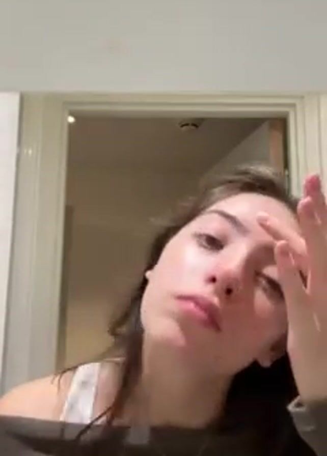 young woman applying makeup to her face. She squeezes a tube of makeup and then dabs spots of makeup onto her forehead, cheeks and chin. She then uses her fingers to rub the makeup into her face. She has dark hair and is wearing a dark green off-the-shoulder shirt. The scene is in a bathroom. A white door frame and hall is visible in the background. The ceiling is white and a smoke detector is visible.