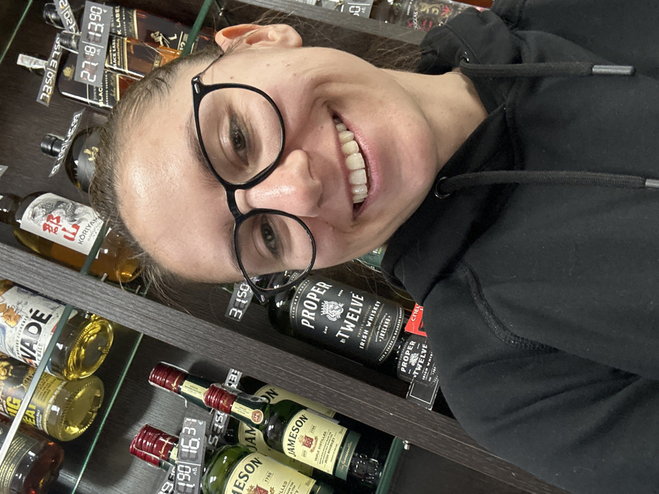 A light-skinned female individual, approximately in her twenties or thirties, is captured in an eye-level selfie, smiling broadly with her teeth visible, and looking directly at the camera. She has brown hair pulled back and wears black-rimmed eyeglasses and a plain black hooded sweatshirt. The background consists of shelves in a retail alcohol establishment, likely a supermarket or liquor store, stocked with various bottles of spirits. Prominently displayed on the shelves are multiple bottles of Jameson Irish Whiskey, one with a visible price tag of "16.37" (presumably Bulgarian Lev). Directly behind the subject's head is a large bottle of Proper Twelve Irish Whiskey. In the upper right, bottles of Johnnie Walker Black Label are visible with price tags displaying "27.18" and "13.90". Other visible brands include a bottle labeled "WADE" and a bottle of Kōriyama Japanese Whisky with Japanese characters. The pricing structure and types of alcohol suggest the location is a retail store within Sofia, Bulgaria.