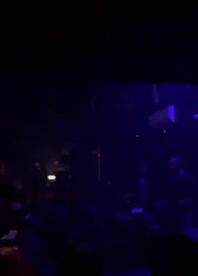 interior of a dimly lit VIP area in what appears to be a nightclub or lounge. There are several people in the frame, some standing and others seated at tables. The lighting is primarily blue with occasional white spotlights sweeping across the room. A "VIP" sign is visible in the foreground. People are milling around and talking, and there is music playing in the background. The area is dark, and details are somewhat obscured, but it's clear that people are socializing in an exclusive setting.