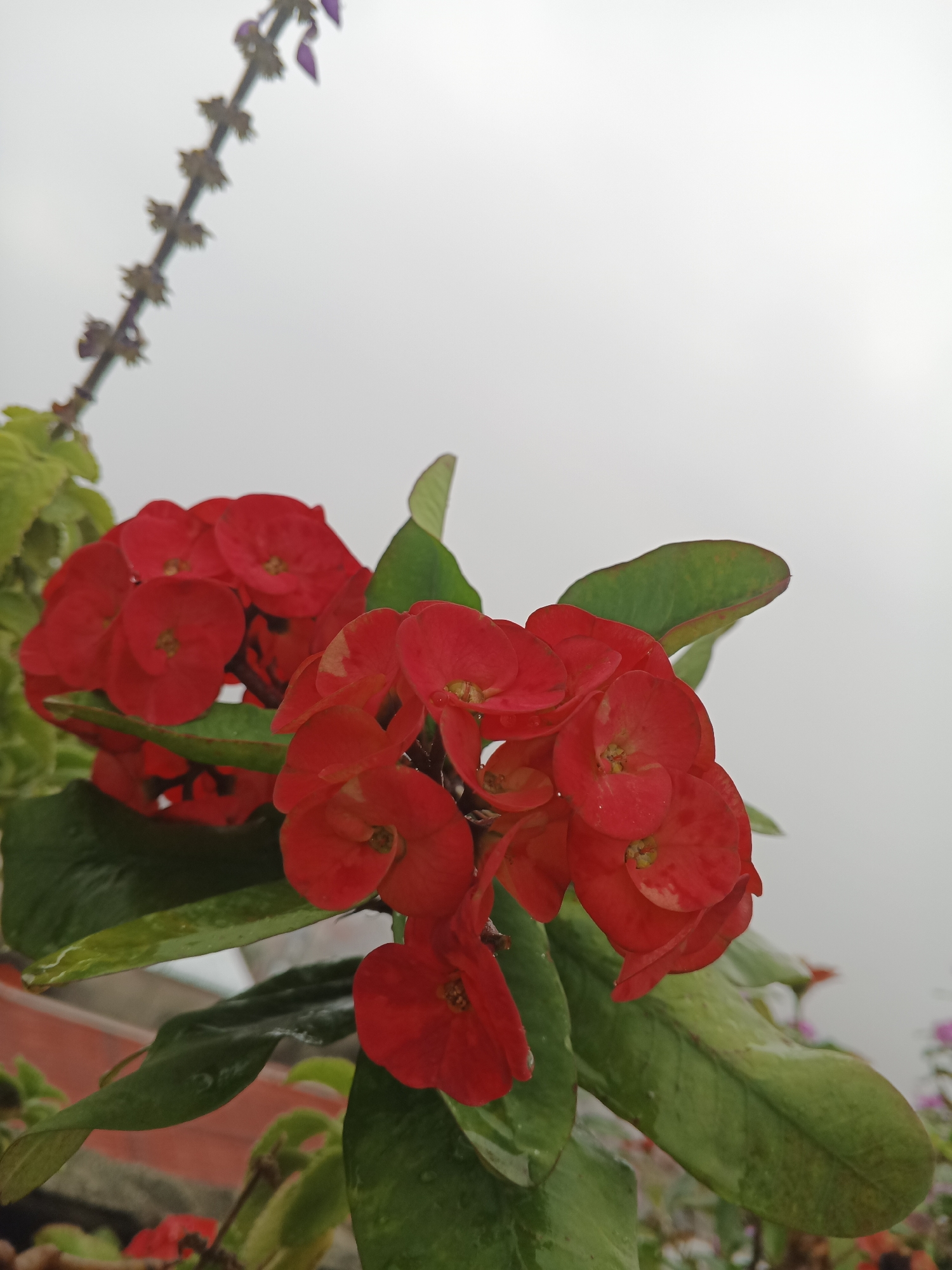 The image depicts a close-up view of a Crown of Thorns plant (Euphorbia milii) with bright red flowers and green leaves. The plant appears to be wet, possibly from rain or dew. In the background, the sky is overcast and white. A stalk with small purple flowers can be seen in the upper left corner. The location of the image is Caracas, Venezuela.