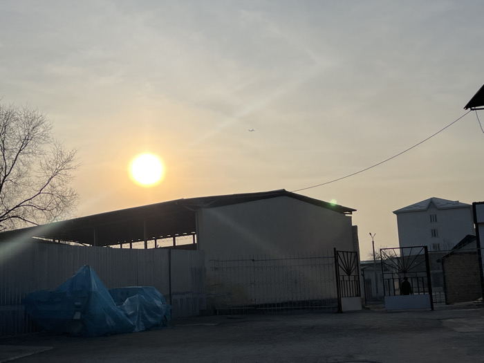 The scene, located in Unknown, Unknown, depicts an outdoor urban or industrial setting at sunrise or sunset. The sun, a bright yellow-orange orb, is prominently positioned in the upper-left quadrant of a hazy, pale sky, generating noticeable lens flare. A small, dark-silhouetted aircraft is visible in flight in the upper-mid-left sky. In the midground, a large, dark-roofed industrial or storage-type building with light-colored walls extends horizontally, partially obscured by a metal fence. Resting on the paved ground in front of this structure is a large, irregularly shaped object covered with a crinkled blue tarp. To the right of the covered object, an open, dark metal gate with a geometric, decorative top stands. Beyond the gate, a single individual, silhouetted against the background, is visible standing. Further in the background to the right, a multi-story white building with a distinctive white, multi-pitched roof and dark windows is partially visible. A leafless tree occupies the far left edge of the frame. A dark overhead cable extends across the upper-right portion of the image.
