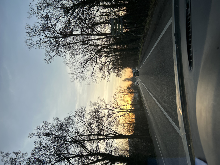 A road stretches into the distance, flanked by bare trees silhouetted against a pale sky with a touch of orange glow
