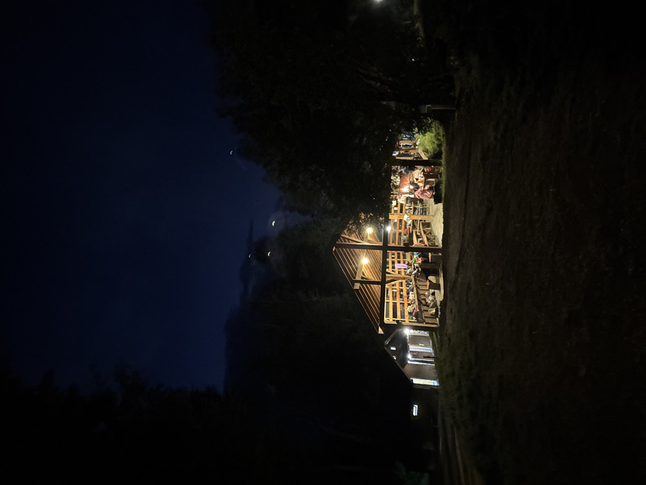 The image depicts a nighttime scene. A wooden gazebo with a visible roof structure is illuminated and filled with people. To the left of the gazebo, a smaller building with lit windows is visible. The sky is dark with subtle crescent shapes. Trees frame the scene, and darkness dominates the foreground. Overall, the image conveys a sense of a gathering or event taking place in a rustic setting.