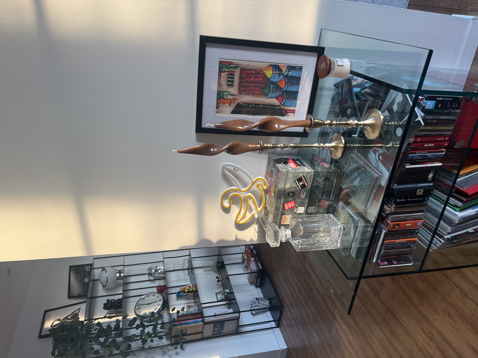 A glass table with black legs sits against a white wall. On the table are two candlesticks with twisted brown candles, a framed painting, a candle jar, a decorative clear glass bottle, a tin box with stickers, a yellow neon banana, and a stack of CDs. A black shelf with glass shelves sits against the wall below the table, displaying decorative items and books, and a plant is partially visible on the bottom shelf. Sunlight casts a shadow on the wall behind the table.