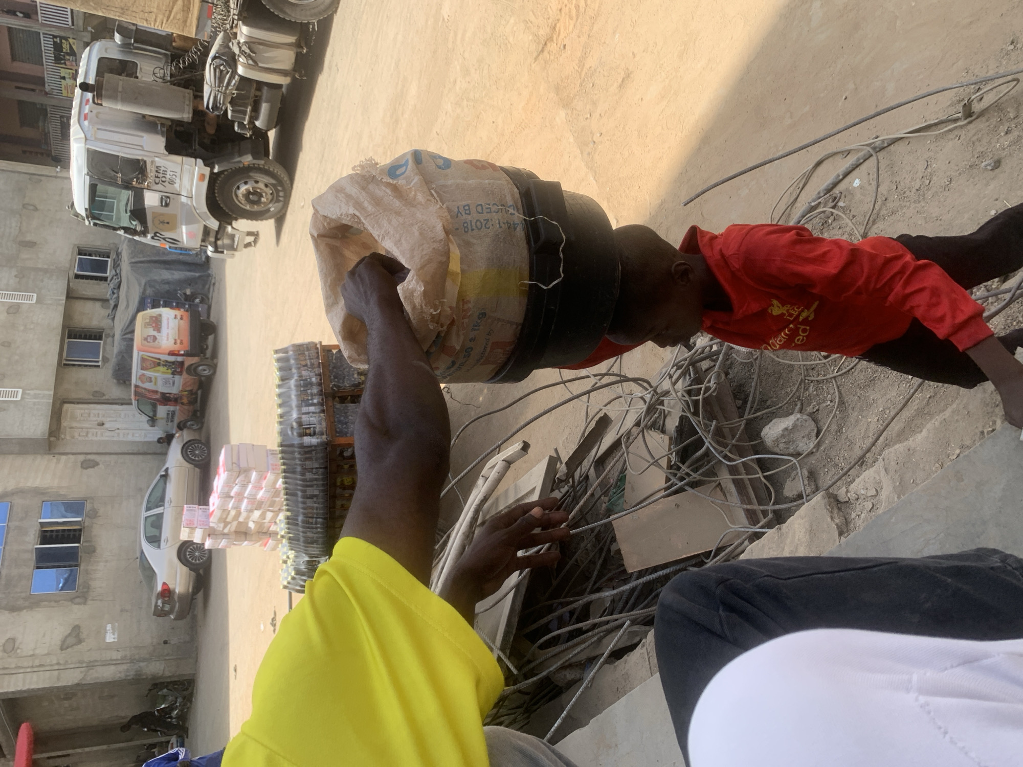 In Fagge C, Nigeria, an outdoor scene depicts a human interaction amid commercial activity and urban infrastructure. The foreground features the partial view of a person wearing a white shirt and dark pants, seated, with a dark-skinned arm in a yellow short-sleeved shirt extending towards a child. This arm is positioned over a young, dark-skinned child, possibly male, wearing a red long-sleeved shirt with a yellow "Liverpool FC" crest and dark pants. The child is carrying a load on their head, comprising a black plastic basin topped with a light-colored sack, marked with "50 ± 1KG" and a date "44-1-2018." The hand of the person in the yellow shirt is near or touching the sack on the child's head, suggesting stabilization or interaction with the load. To the immediate left of the child and the seated individual is a cluttered area with construction debris, including rebar, concrete fragments, and entangled electrical wires on the dirt ground. The midground and background consist of a dusty, unpaved street or open area. Parked vehicles include a light-colored sedan, a small white commercial van with orange branding (partially visible "CLEVER & WINNER"), and a large white semi-truck tractor unit displaying "CFM /OB/ 0051." Buildings with concrete facades and varying window types, including blue reflective windows, line the background. Stacks of packaged goods are visible on a stand behind the sedan, and a second stand with bottled beverages is partially visible behind the person in yellow. The lighting indicates clear daylight conditions.