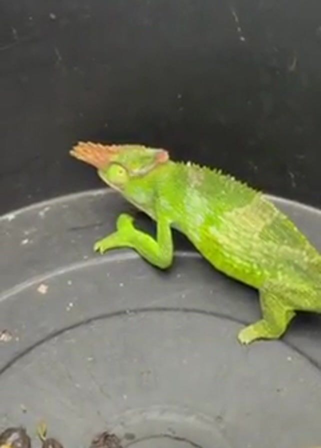 A green and tan chameleon with a large, spiky brown crest on its head sits in a black bucket