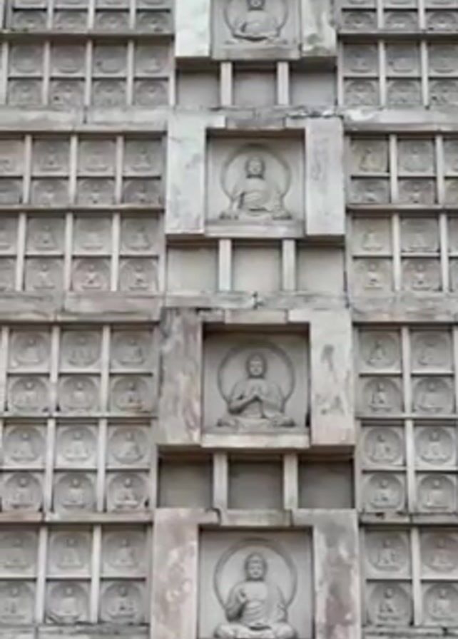 The camera pans upward to reveal a large golden Buddha statue. The statue is seated in the lotus position atop a building with a facade that is decorated with square relief carvings of a seated Buddha.