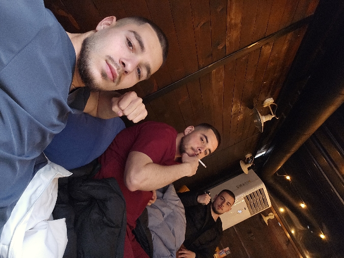 An indoor photograph depicts three young adult males within an establishment in Pleven, Bulgaria