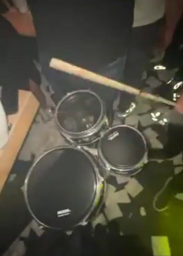 A person in jeans and a black shirt plays a small three-piece drum kit with chrome rims and black heads. Other people stand nearby. The drum kit sits on a table with a patterned tablecloth, next to a white mug. The scene then transitions to a wide shot of a crowd of people in a club, with bright, colorful stage lights moving above.