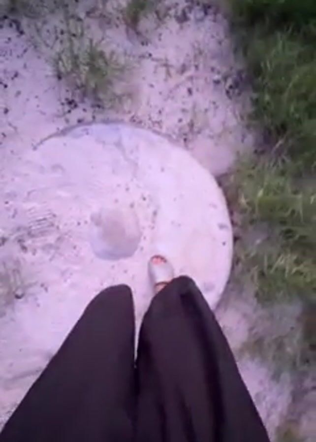 A person wearing black pants and light-colored sandals steps onto a round, concrete object, then walks along a path lined with a chain-link fence