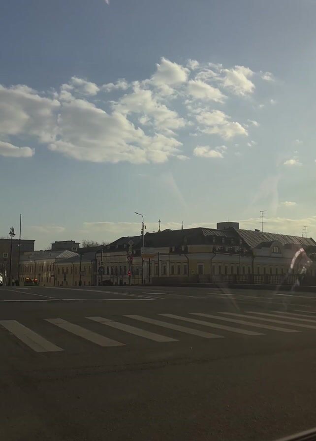From within a car, the video captures a view of a city intersection on a sunny day with a partly cloudy sky. The intersection is marked with pedestrian crosswalks. Buildings of varying styles line the streets. The buildings are predominantly multi-story structures with architectural details, including rows of windows and decorative elements. A white car is seen driving across the intersection. The road surface is asphalt.