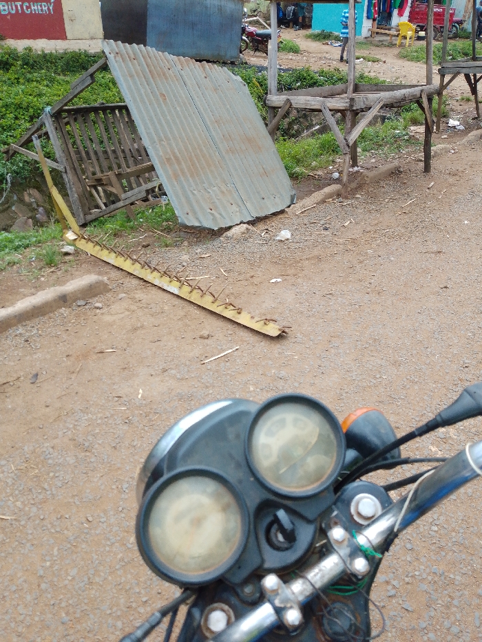 A motorcycle's dashboard is visible in the foreground. Beyond it, an outdoor scene reveals a dilapidated wooden structure with a corrugated metal roof that appears to have collapsed or been dismantled. To the left of the structure is a yellow, toothed blade lying on the ground. Further back, other wooden structures, possibly market stalls, and a building with "BUTCHERY" painted on its facade can be seen. The setting appears to be a rural or semi-urban area with dirt roads and scattered vegetation.