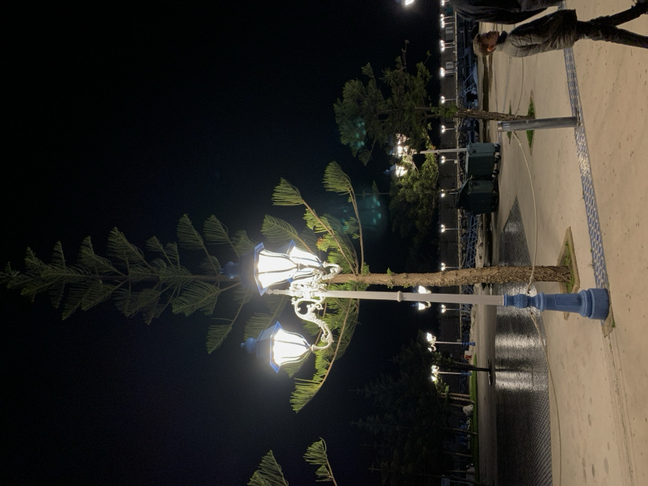 - "A nighttime scene shows Norfolk Island pine trees lining a sidewalk" by FM-Gn7EC2, licensed under CC BY 4.0