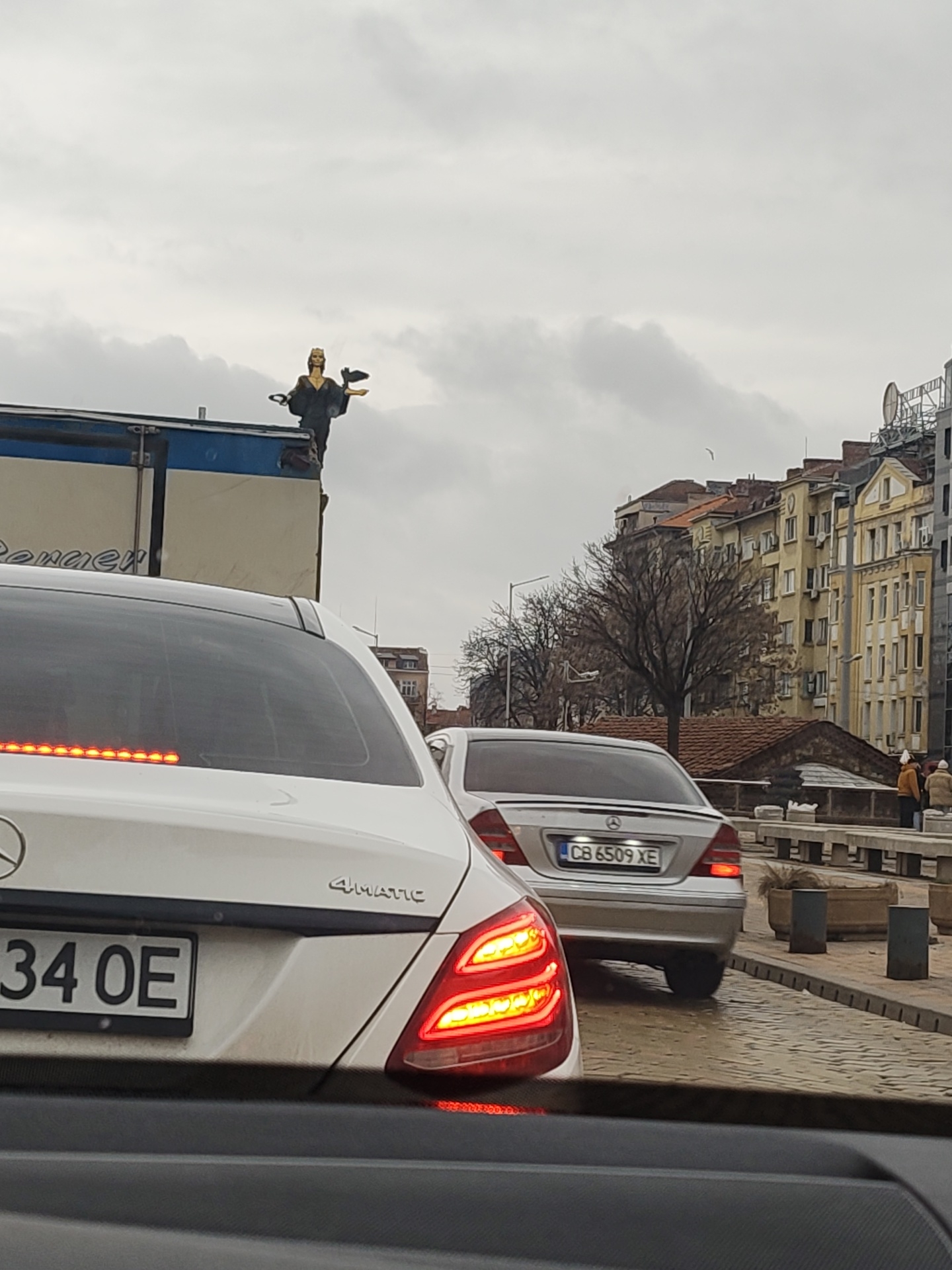 street scene in Sofia, Bulgaria, with a white Mercedes-Benz bearing the license plate "34 OE" in the foreground. Behind it is another silver Mercedes-Benz with the license plate "CB 6509 XE." Both cars appear to be stopped in traffic. In the background, atop a truck, is a statue, appearing to be a figure holding a bird and a wreath. Buildings are visible in the background, along with bare trees, and figures walking along a pedestrian area. The sky is overcast. The image was likely taken from inside a vehicle.