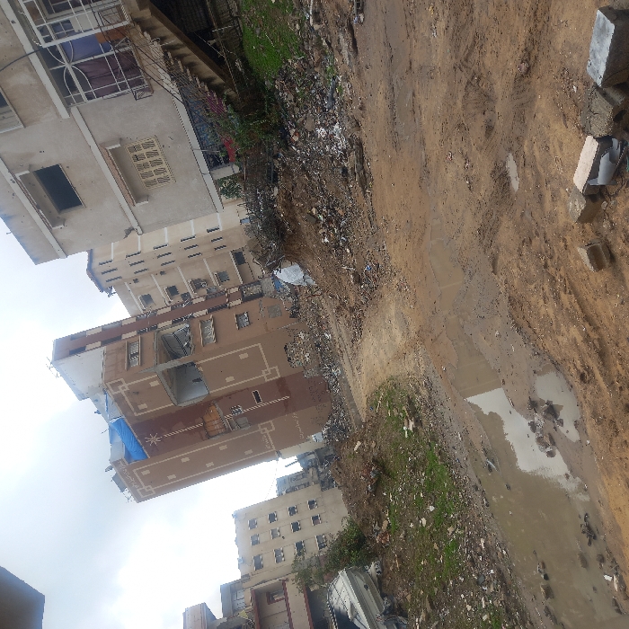 The image depicts a devastated urban landscape in Khan Yunis, Palestinian Territory, under an overcast sky. The foreground features a muddy, unpaved dirt path with deep ruts and several murky puddles reflecting the sky. Scattered concrete blocks and debris lie on the ground, particularly to the right. In the midground, large piles of mixed rubble, earth, and debris line the path. To the left, a white vehicle, possibly a car or van, is partially overturned and embedded in a mound of dirt and rubble. To the right, a white tarp or sheet is visible amidst a large pile of debris. The background is dominated by severely damaged multi-story residential buildings. A prominent slender, light brown building in the center-left features a decorative facade with geometric patterns and exhibits extensive structural damage, including blown-out sections on its upper floors and a blue tarp partially covering its roof. To the far left, another multi-story building appears partially damaged. To the right, a light-colored building with an external staircase leading to an upper entrance also shows signs of damage. Other less distinct buildings are visible further back, contributing to the overall scene of destruction. No individuals are present in the image.
