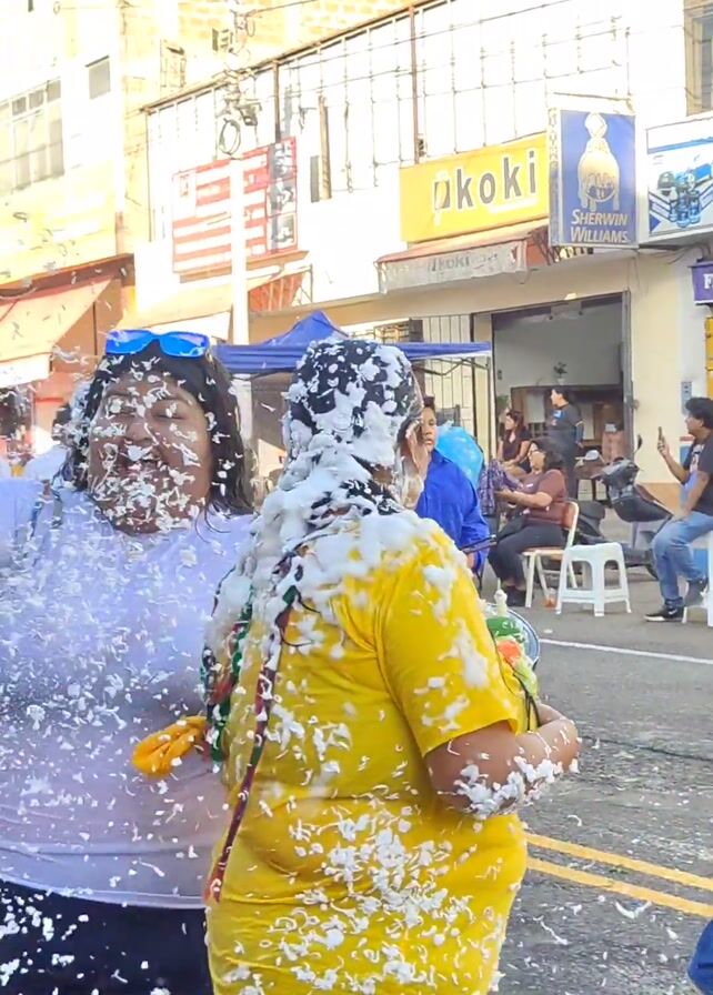 The video captures a lively street celebration. Three women covered in white confetti stand at the forefront, smiling and holding water guns. Behind them, a marching band parades through the street, playing instruments. Shops line the street, and bystanders watch the festivities unfold.