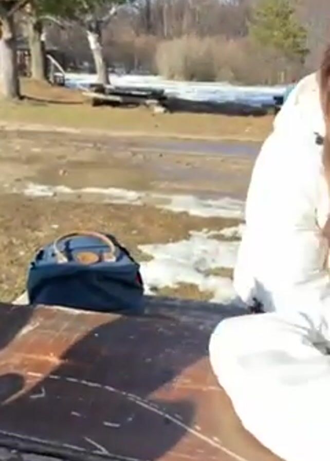 The video begins with a close-up of a picnic table littered with items like a JBL speaker, a can of beer, and a roll of toilet paper. The camera then pans up to reveal a woman wearing sunglasses and a white jacket and pants seated at the table. Other items, including cans of drinks and a water bottle, are also visible on the table. The camera then pans out further, showcasing a landscape with patches of snow, puddles, and bare trees, suggesting it might be early spring. In the background, people are seen walking on a snowy slope towards a forested area under a clear blue sky.