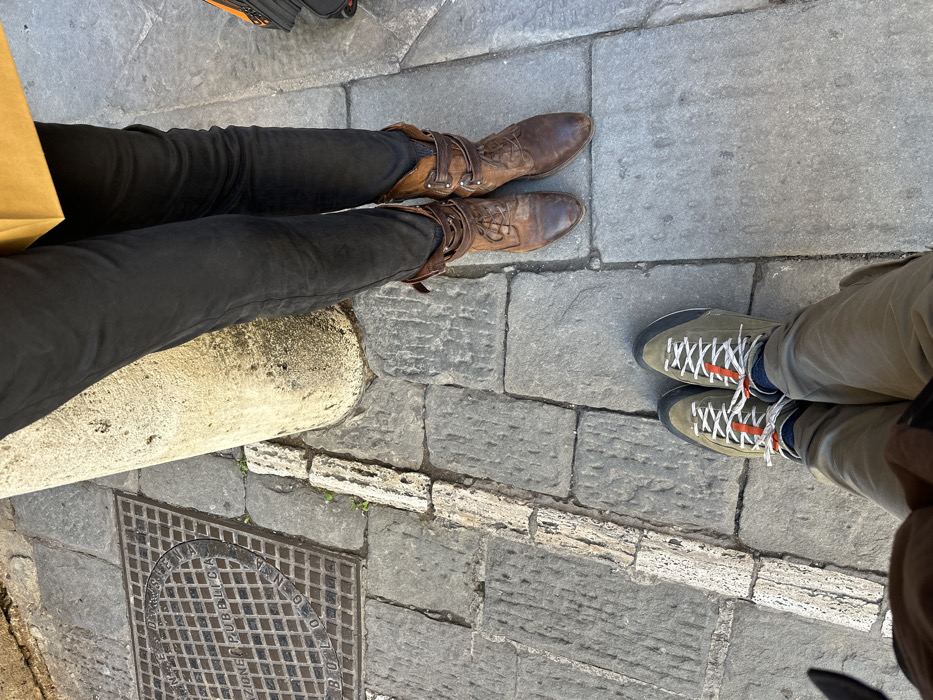 An overhead view captures the lower legs and feet of two individuals standing on a cobblestone street in Siena, Italy