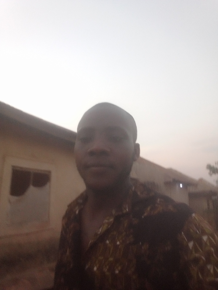 The image displays a male individual, appearing to be a young adult, with a dark complexion and a closely shaved head, positioned centrally and facing directly towards the camera. He is wearing a collared shirt featuring a dark base with an intricate, light-colored, possibly abstract or geometric pattern. A dark strap or object is visible across his left shoulder. The subject's face and upper torso are moderately blurred, suggesting either slight motion during capture or a shallow depth of field. The scene is an outdoor environment in Akwanga, Nigeria, consistent with a semi-urban or residential area. In the background to the subject's left, a light-colored, single-story building is visible. This building features a rectangular window opening that appears to be without glass, revealing a dark interior void or covering. To the subject's right and further back, a second building is discernible, exhibiting a small, distinct light source. The upper portion of the frame consists of a light, largely undifferentiated sky, indicative of an overcast condition or a specific time of day with muted lighting.