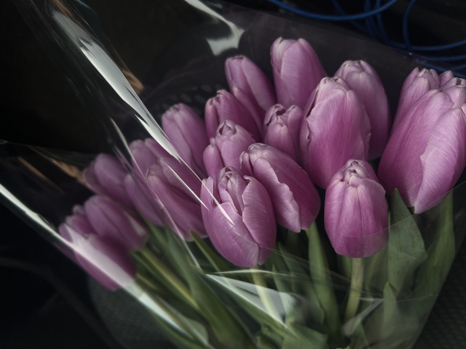- "The image displays a bouquet of approximately twenty vibrant purple tulips, still in closed bud or partially open, with visible green stems and leaves, tightly arranged and partially encased in a crinkled, transparent plastic wrapping" by FM-dvWu13, licensed under CC BY 4.0