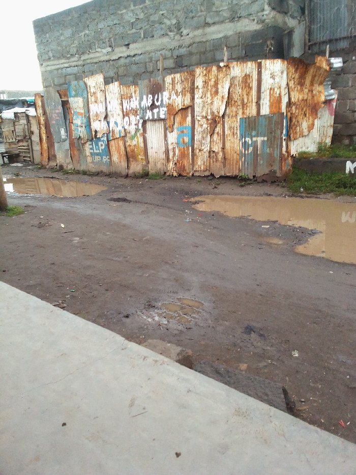 This image captures an unpaved, muddy street or pathway within a low-income area of Nakuru, Kenya