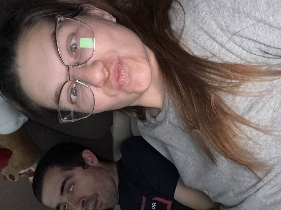 The scene depicts two individuals indoors, likely within a private residence in Sofia, Bulgaria. In the foreground, a female with long brown hair and fair skin is captured from the chest up, wearing a light grey long-sleeved top and light-framed cat-eye eyeglasses. Her facial expression consists of pursed lips in a "duck face" pose and wide, slightly crossed eyes. A distinct bright green rectangular reflection is visible on the right lens of her glasses. Behind and to the left of the female, a male with short dark hair and fair skin is partially visible. He wears a dark blue t-shirt with a red and white design, including the letters "OR," visible on his left shoulder. His head is tilted back, and his eyes are rolled upwards, showing the sclera, indicating a humorous or exasperated demeanor. The background features a brown upholstered surface and obscured objects, including part of a brown teddy bear and a white fluffy item, consistent with a casual living space. The lighting is internal.