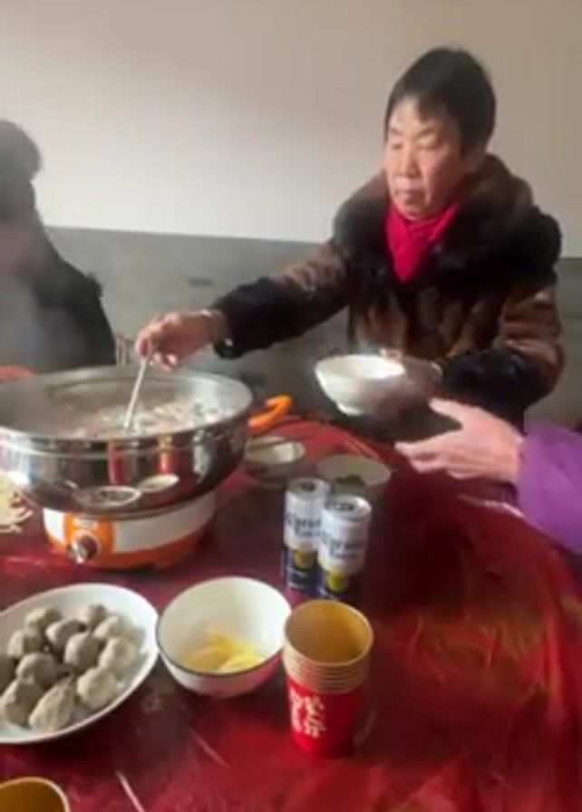 A woman in a fur coat is sitting at a table with other people. She uses a ladle to serve soup from a pot into a white bowl. On the table, there's a plate of meatballs, lemon wedges, and cans of Corona beer. The table is covered with a red tablecloth that has gold designs. The room appears to be simply decorated, with a framed picture on the wall. Steam rises from the pot.