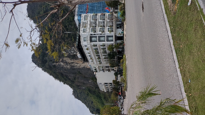 The image captures an urban street scene in Hong Gai Ward, Vietnam, beneath an overcast sky. In the immediate foreground, a strip of green grass with a concrete curb runs parallel to an asphalt roadway. A palm frond extends into the lower left frame. Scattered litter, including a white item and a small red item, is visible on the grass and asphalt. The roadway, which appears to be part of a multi-lane street or roundabout, features a central landscaped island with bushes. The midground is dominated by a collection of multi-story buildings situated at the base of a large, steep, tree-covered limestone mountain that forms the background. A prominent white five-story building, characterized by numerous balconies adorned with potted plants and dark grey window frames, occupies the central midground. A rooftop terrace with communication equipment is visible on this structure. To its left, another similar white building is partially visible. To its right, a taller, modern building with a blue glass facade is partially depicted. Vehicular traffic is present on the street in front of these buildings, including a large white bus, a brown SUV, and several motorbikes. Indistinct human figures are visible near the vehicles and building entrances. Vietnamese flags are displayed on poles near the buildings on the right side. The background is dominated by a towering, densely vegetated karstic mountain with exposed grey rock faces, signifying a dramatic natural landscape adjacent to the developed area.