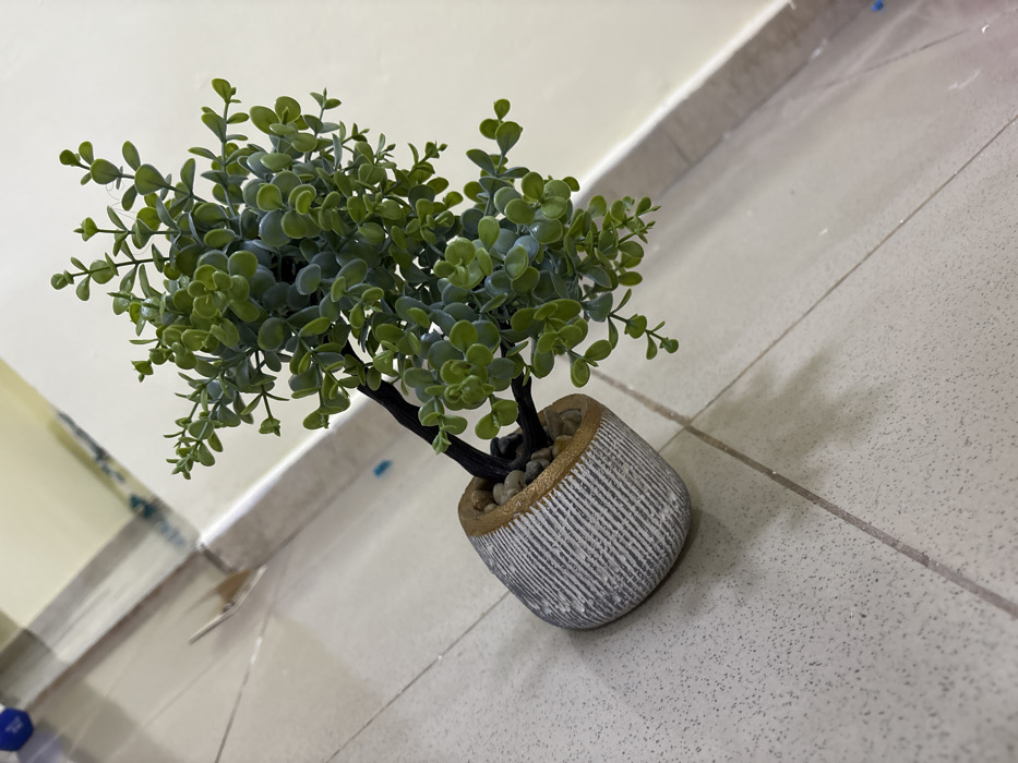 - "An artificial plant in a grey, ribbed pot with a gold-colored rim and small decorative pebbles is positioned on a light-colored tiled floor" by FM-FbAwB2, licensed under CC BY 4.0