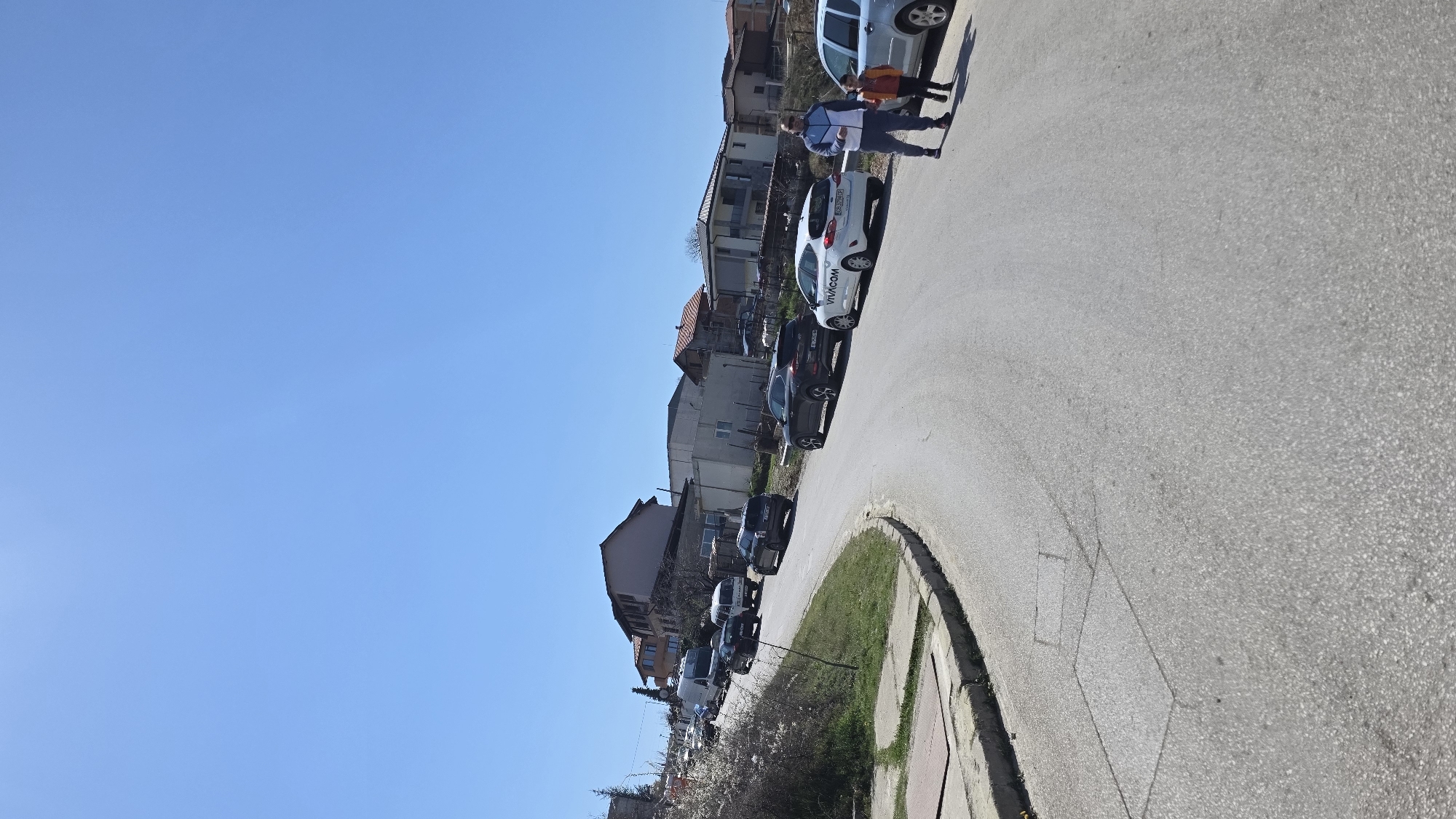 The image depicts a street scene in Marulevo, Bulgaria. The street curves gently to the right and is lined with parked cars along the left side. A white car with "VIVACOM" written on its side is visible. A man wearing a light blue shirt and dark pants is walking along the street, accompanied by a person in an orange shirt. Buildings are visible behind the parked cars. The sky is clear and blue. A sidewalk runs along the right side of the street.